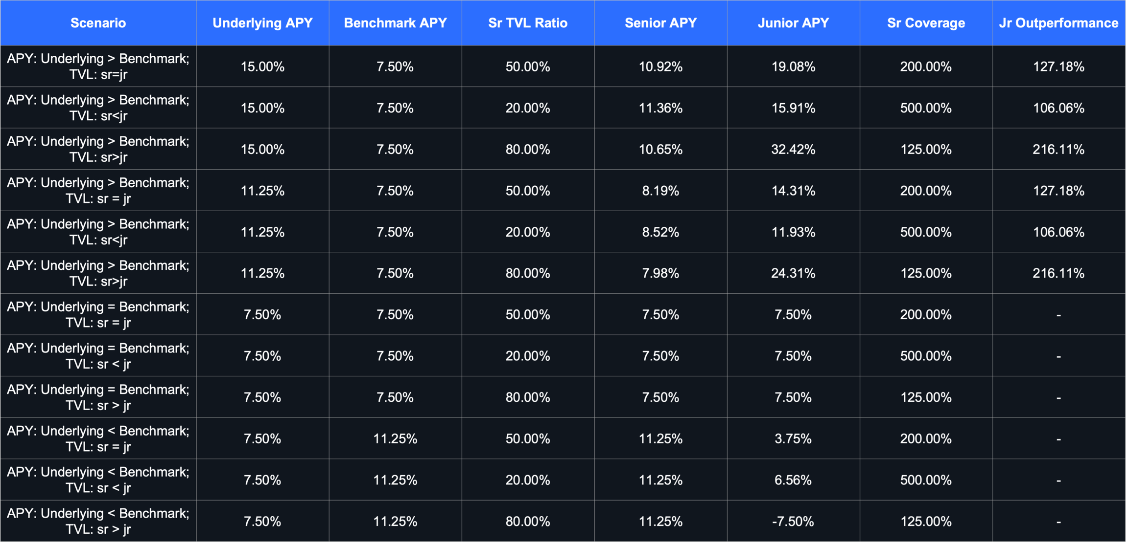 The table below shows the estimated APYs of senior and junior tranches under different underlying APY, benchmark rate and senior TVL ratio scenarios assuming x=15%, y=15% and k=0.3.