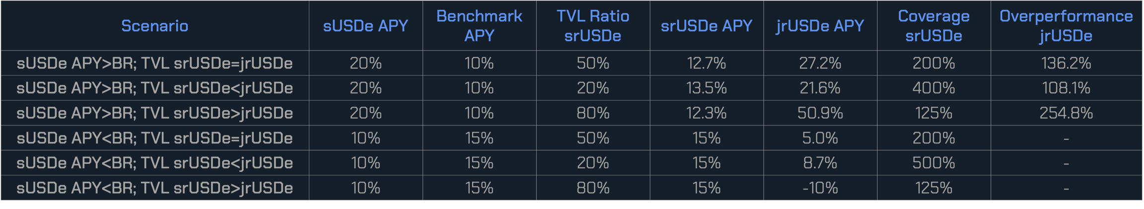The table below shows the estimated APYs of srUSDe and jrUSDe under different sUSDe APY, benchmark rate and srUSDe TVL ratio scenarios.