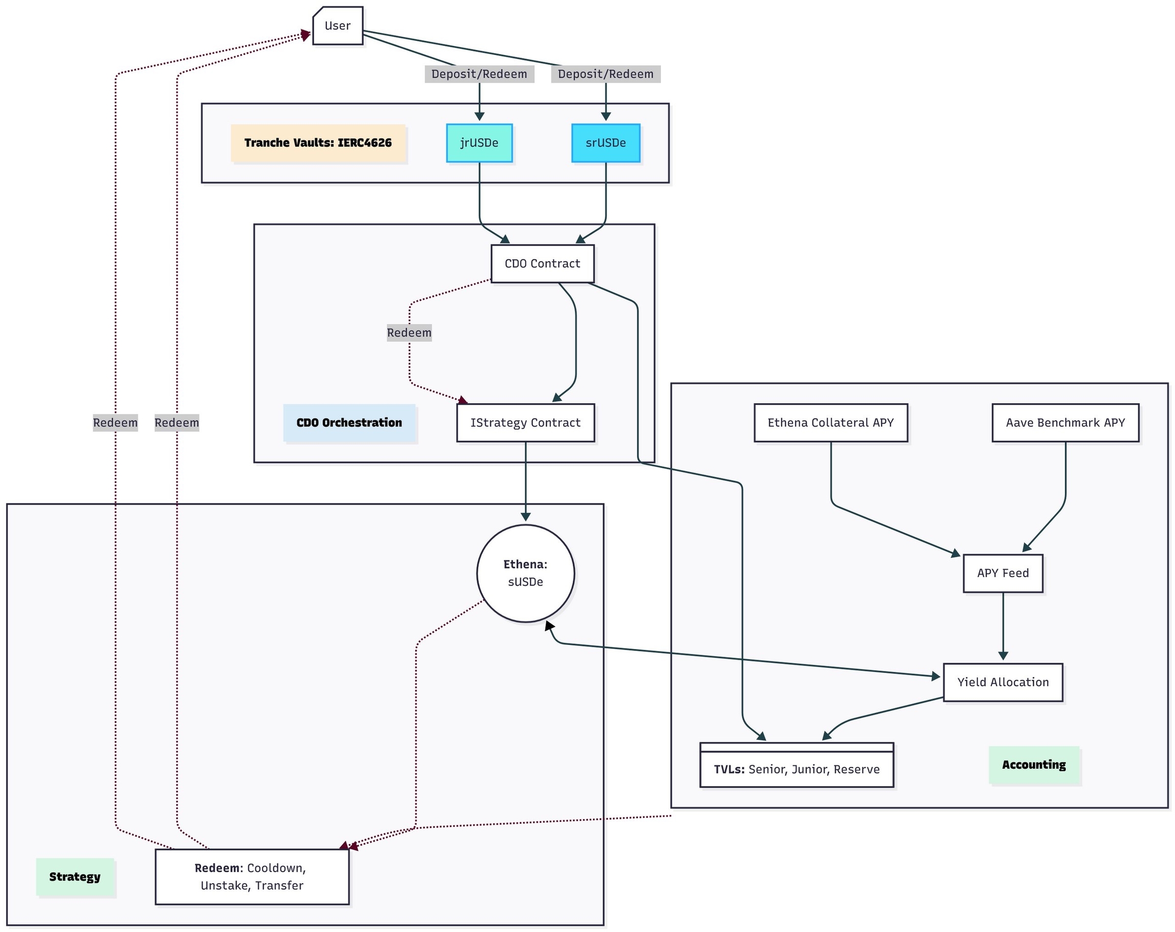 User actions (deposit, withdraw, etc.) are forwarded to the CDO contract (the core orchestrator).